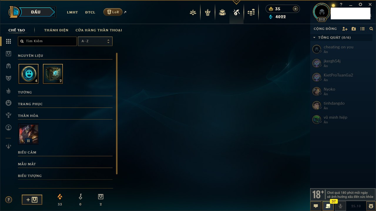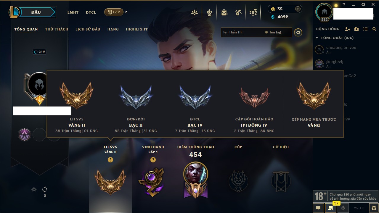 Rank Đơn: Lục Bảo IVKhung: VàngTướng: 171 - Còn 154648 THXTrang Phục: 203Rank ĐTCL: Bạch Kim IVLinh Thú: 69