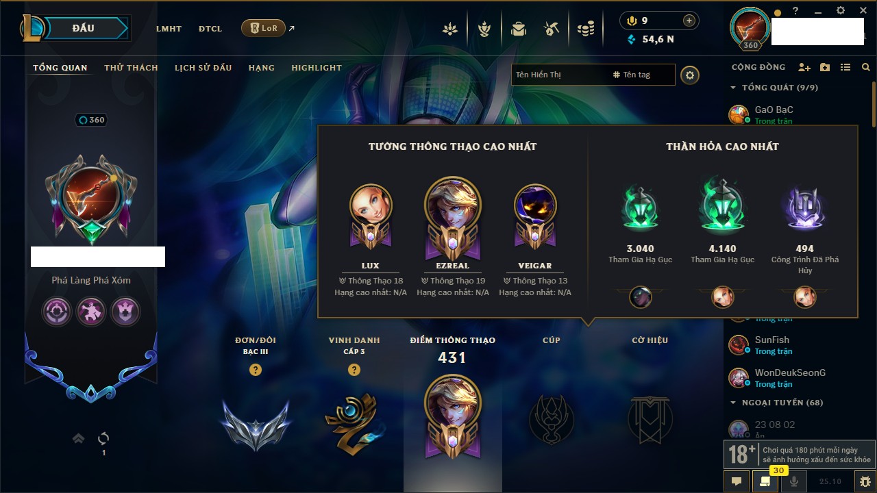 Rank Đơn: Chưa RankKhung: Bạch kimTướng: 172 - Còn 81 THXTrang Phục: 226Rank ĐTCL: Chưa RankLinh Thú: 193
