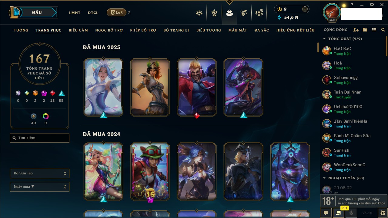 Rank Đơn: Chưa RankKhung: Bạch kimTướng: 170 - Còn 146400 THXTrang Phục: 225Rank ĐTCL: Chưa RankLinh Thú: 134