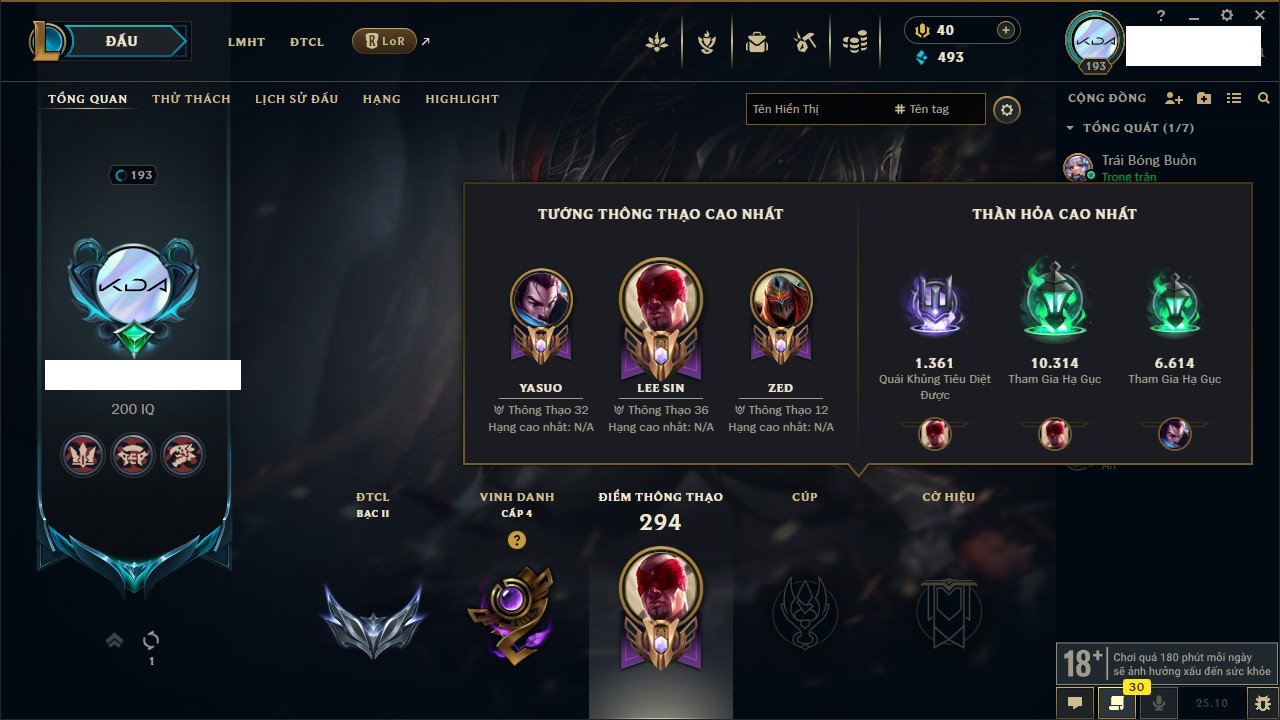 Rank Đơn: Bạch Kim IVKhung: VàngTướng: 171 - Còn 130578 THXTrang Phục: 253Rank ĐTCL: Chưa RankLinh Thú: 20