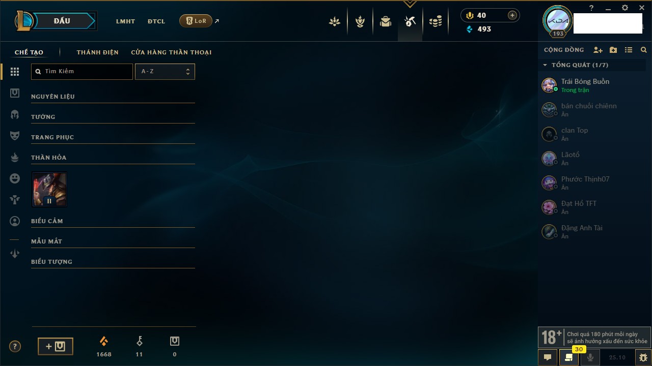 Rank Đơn: Bạch Kim IVKhung: VàngTướng: 171 - Còn 130280 THXTrang Phục: 226Rank ĐTCL: Kim Cương IVLinh Thú: 183
