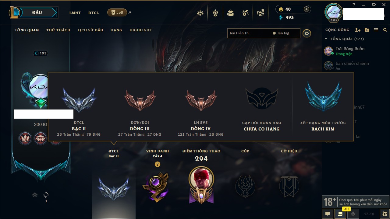 Rank Đơn: Bạc IVKhung: BạcTướng: 171 - Còn 173918 THXTrang Phục: 233Rank ĐTCL: Lục Bảo IIILinh Thú: 26