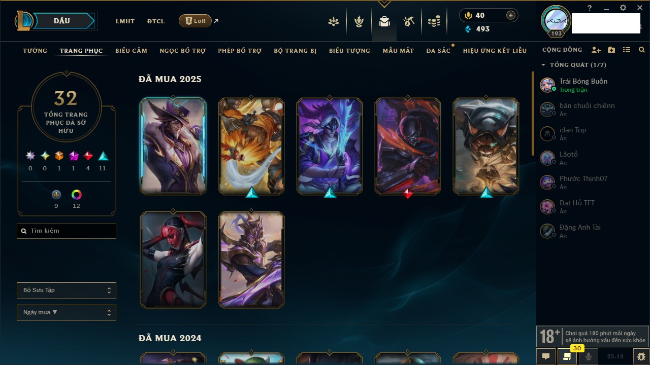 Rank Đơn: Vàng IIKhung: VàngTướng: 171 - Còn 219803 THXTrang Phục: 254Rank ĐTCL: Chưa RankLinh Thú: 78