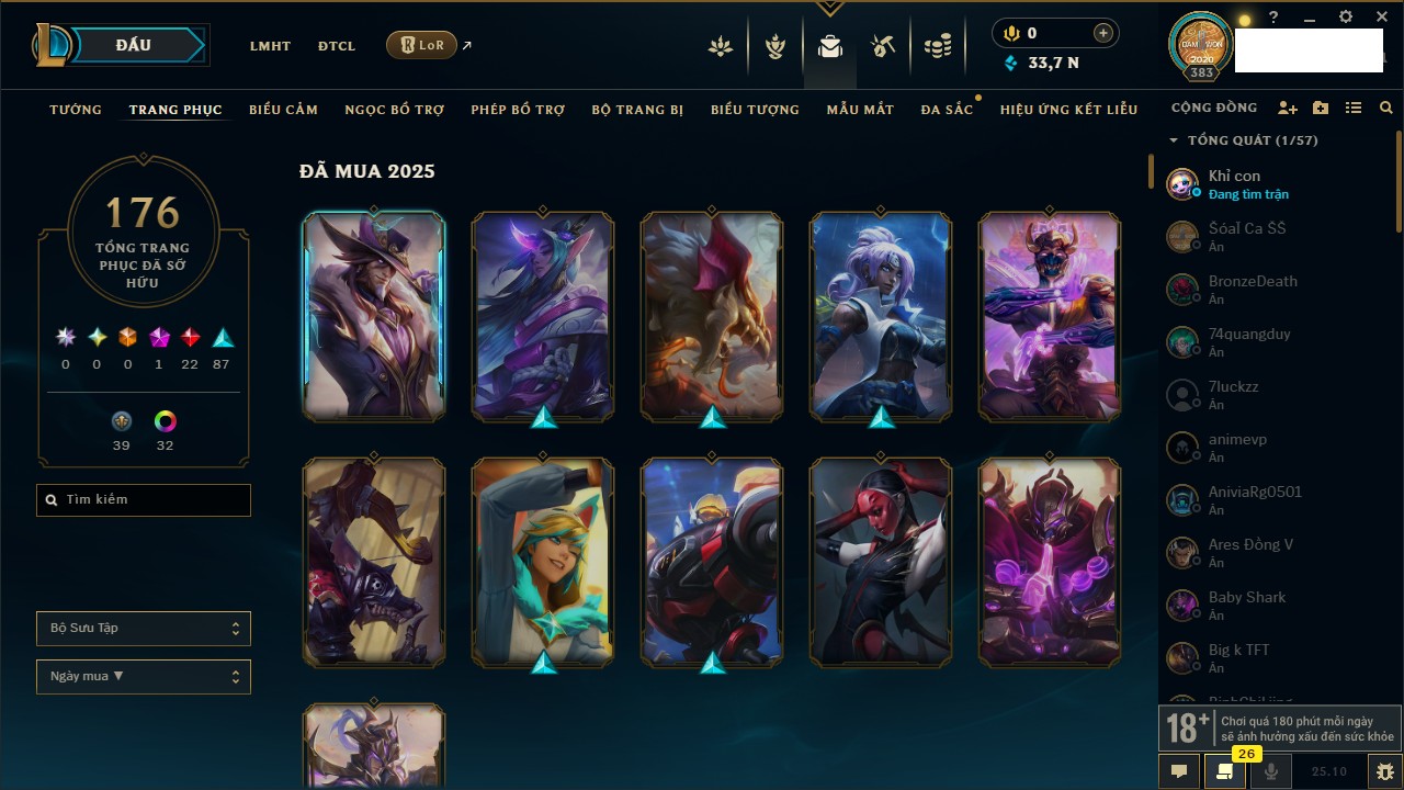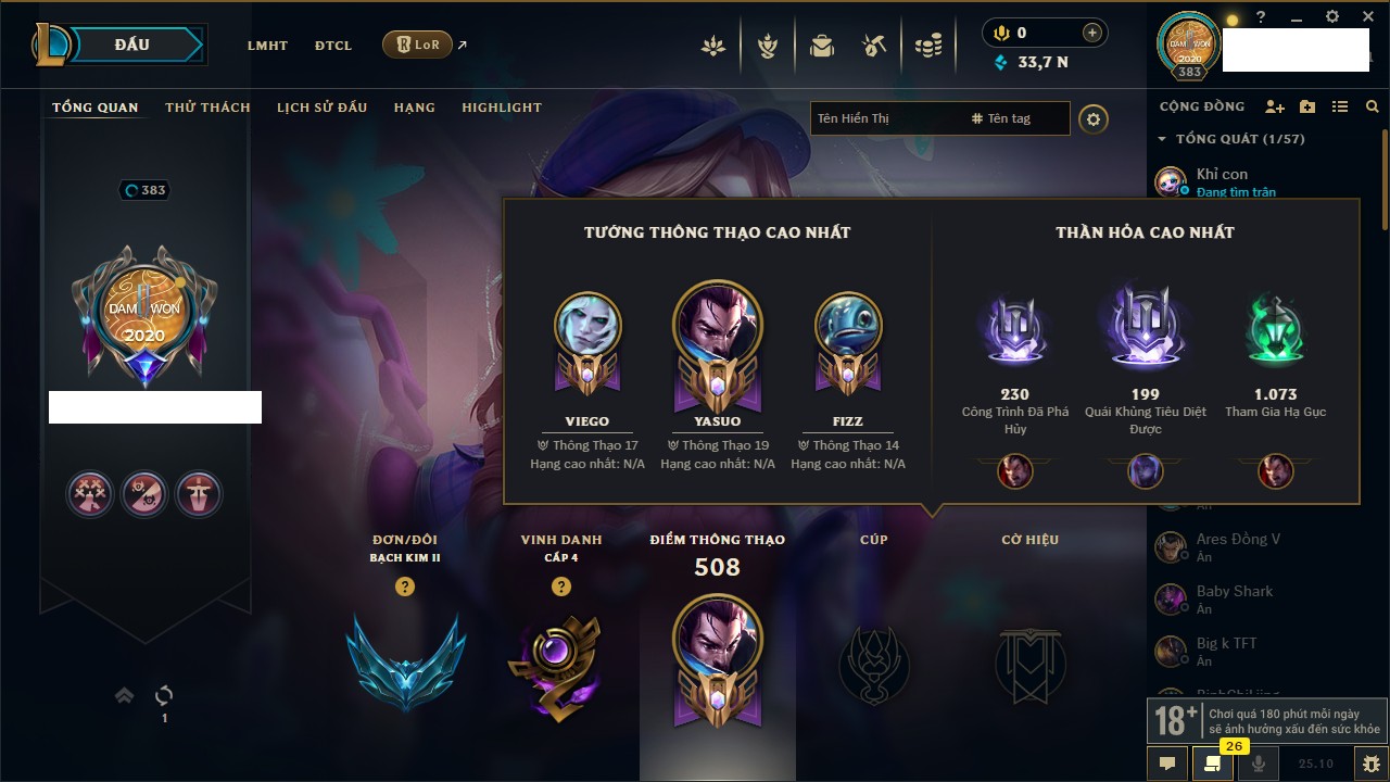 Rank Đơn: Bạch Kim IIKhung: Bạch kimTướng: 171 - Còn 316137 THXTrang Phục: 89Rank ĐTCL: Bạch Kim IIILinh Thú: 94