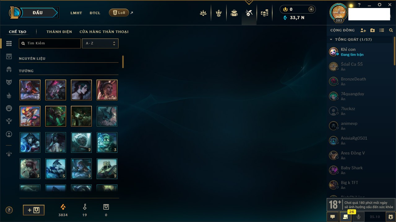 Rank Đơn: Lục Bảo IVKhung: VàngTướng: 171 - Còn 154648 THXTrang Phục: 203Rank ĐTCL: Bạch Kim IVLinh Thú: 69