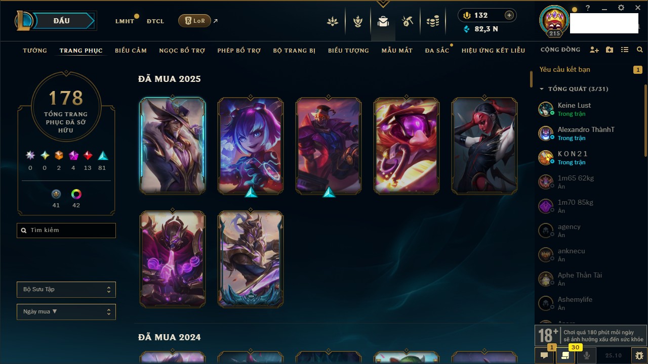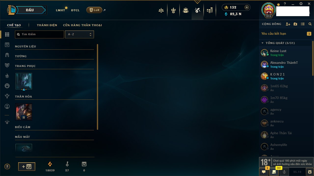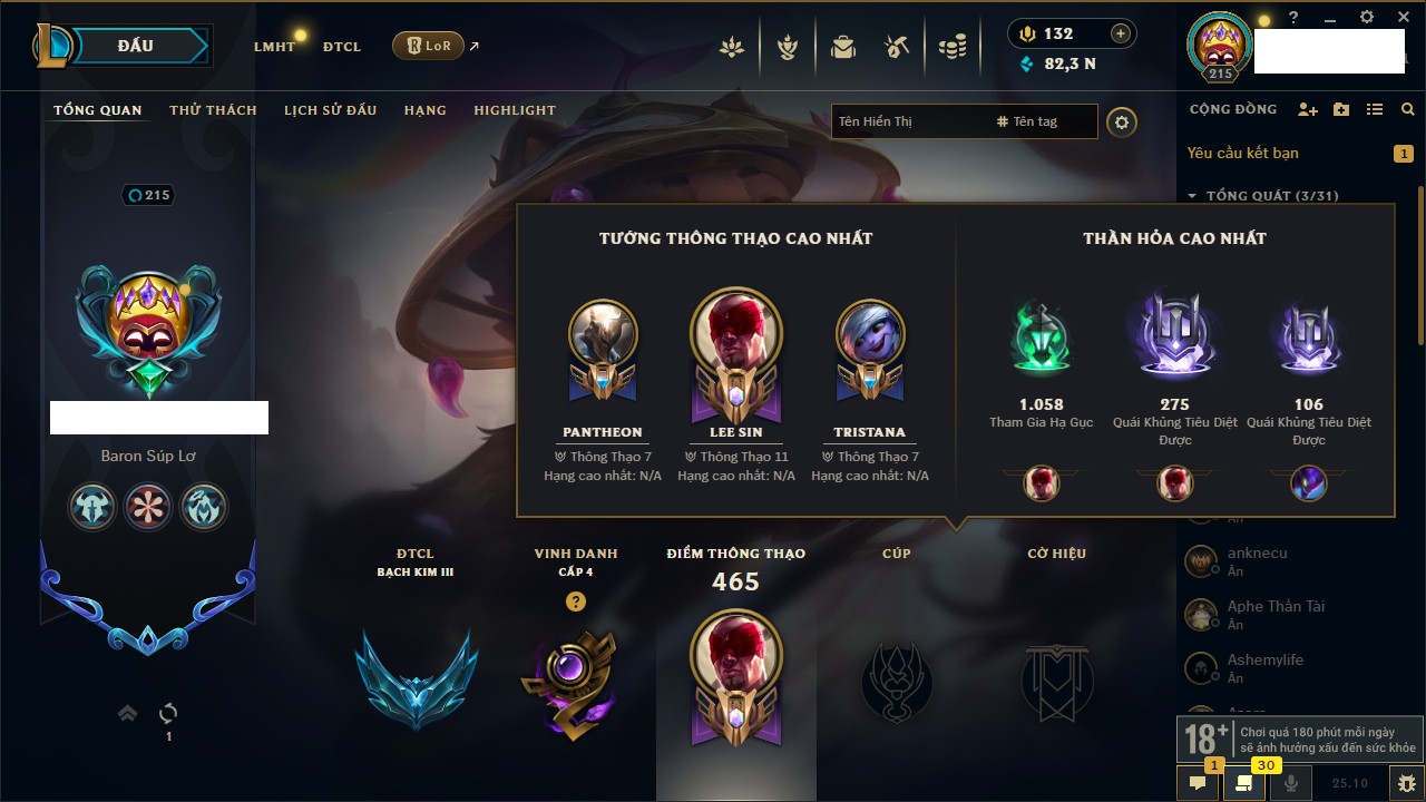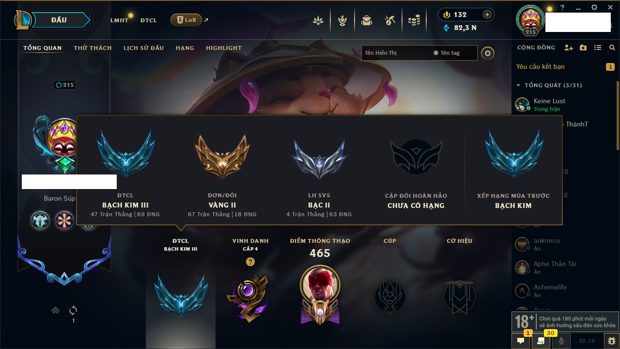 Rank Đơn: Bạch Kim IIKhung: Bạch kimTướng: 171 - Còn 316137 THXTrang Phục: 89Rank ĐTCL: Bạch Kim IIILinh Thú: 94