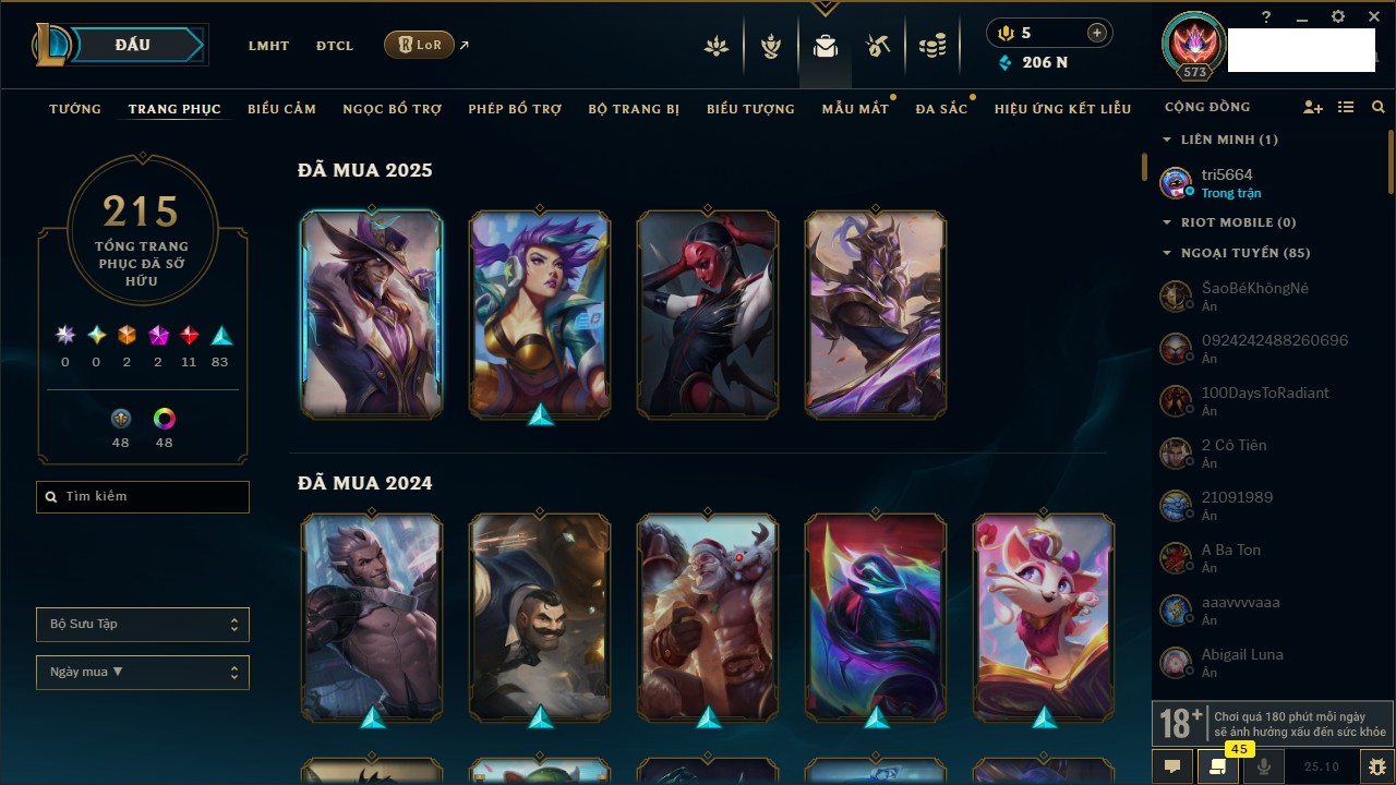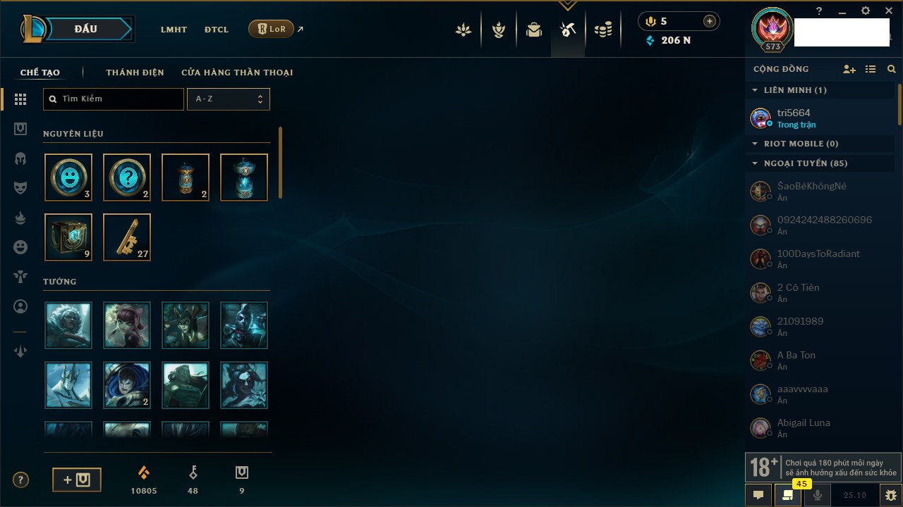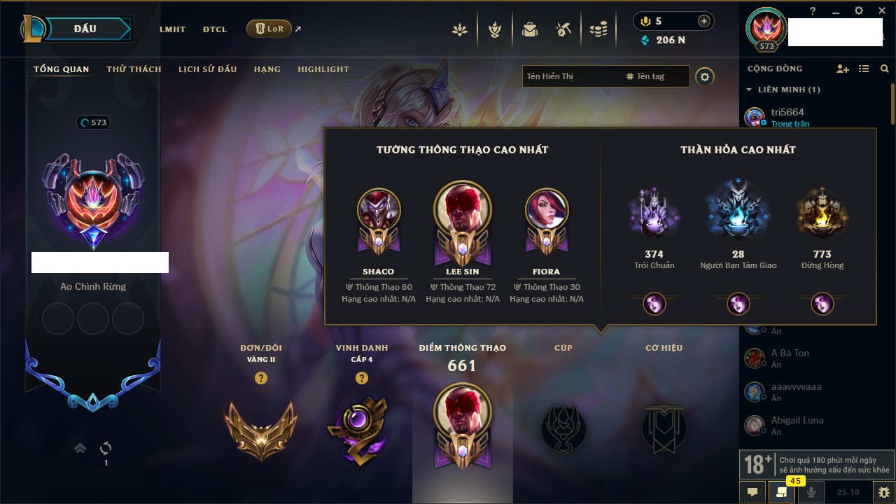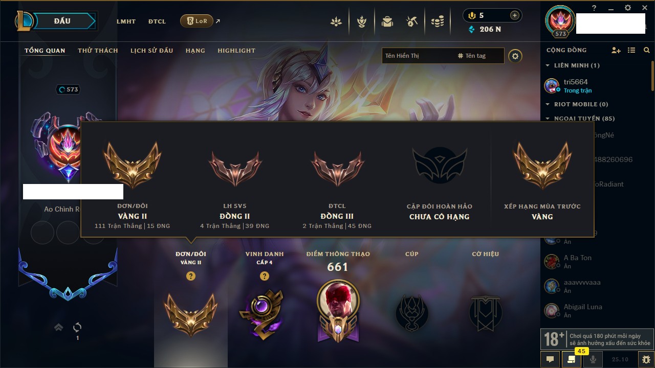 Rank Đơn: Bạc IIIKhung: BạcTướng: 171 - Còn 51045 THXTrang Phục: 220Rank ĐTCL: Sắt IILinh Thú: 141