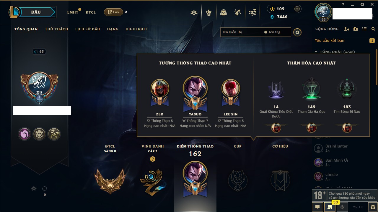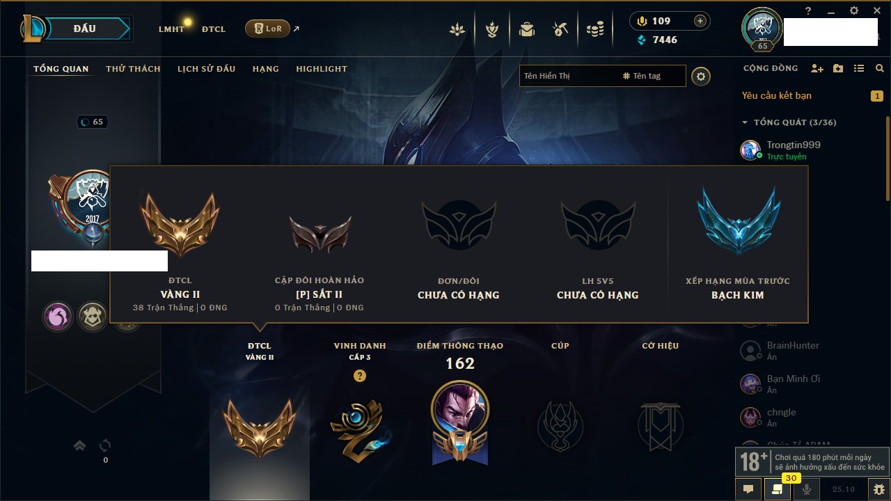 Rank Đơn: Vàng IVKhung: BạcTướng: 166 - Còn 180925 THXTrang Phục: 163Rank ĐTCL: Chưa RankLinh Thú: 67