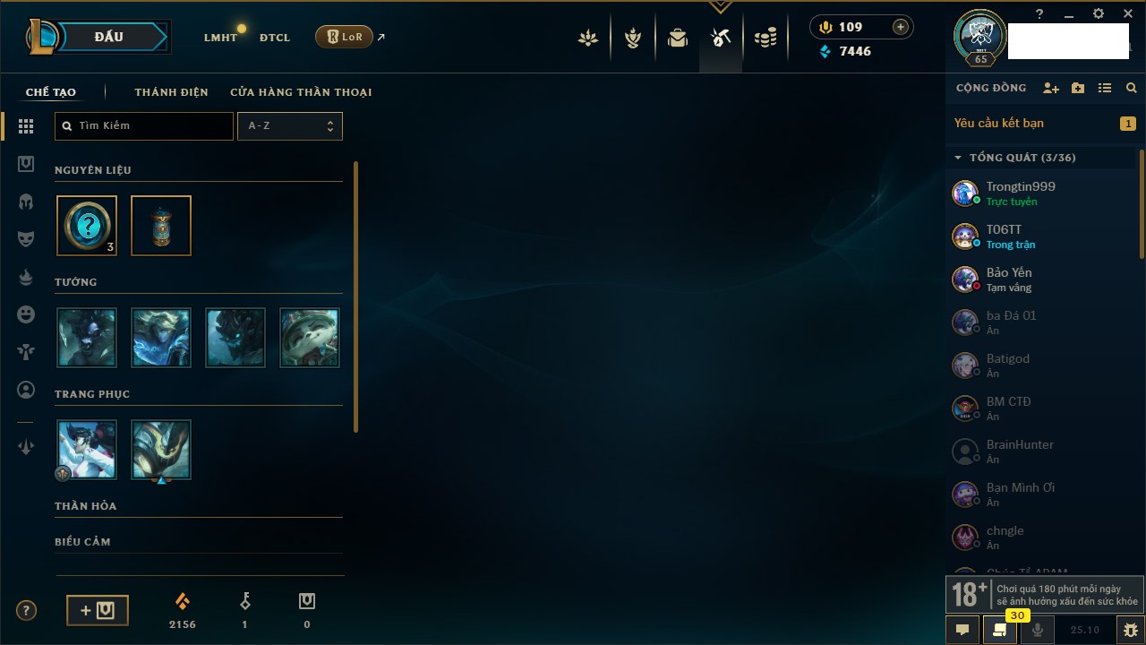 Rank Đơn: Vàng IVKhung: BạcTướng: 171 - Còn 231097 THXTrang Phục: 180Rank ĐTCL: Vàng IVLinh Thú: 110