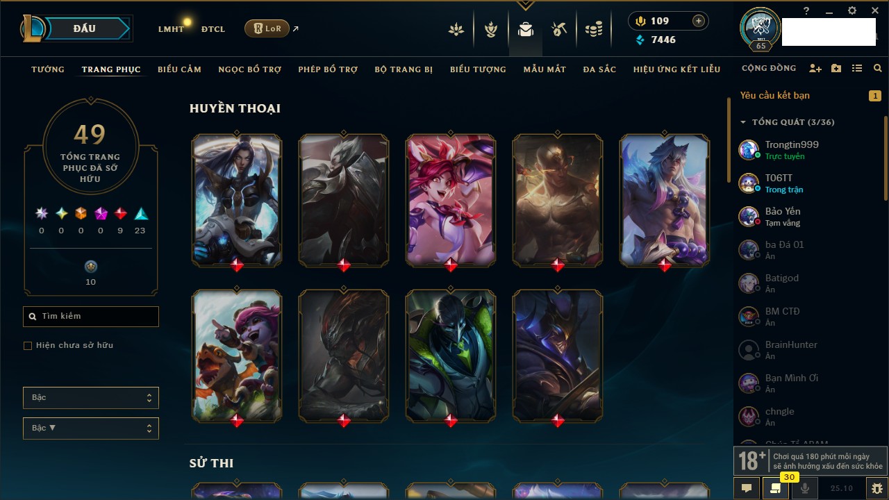 Rank Đơn: Bạc IVKhung: VàngTướng: 172 - Còn 358384 THXTrang Phục: 177Rank ĐTCL: Lục Bảo IILinh Thú: 211