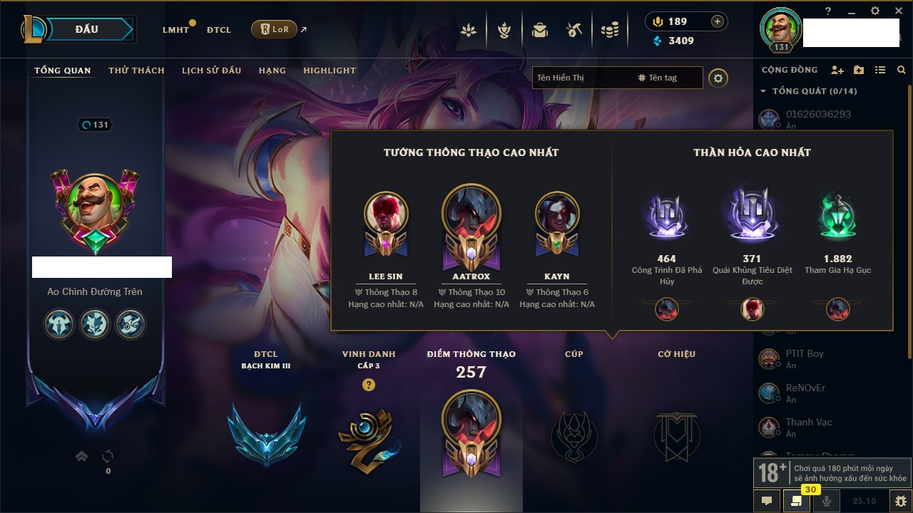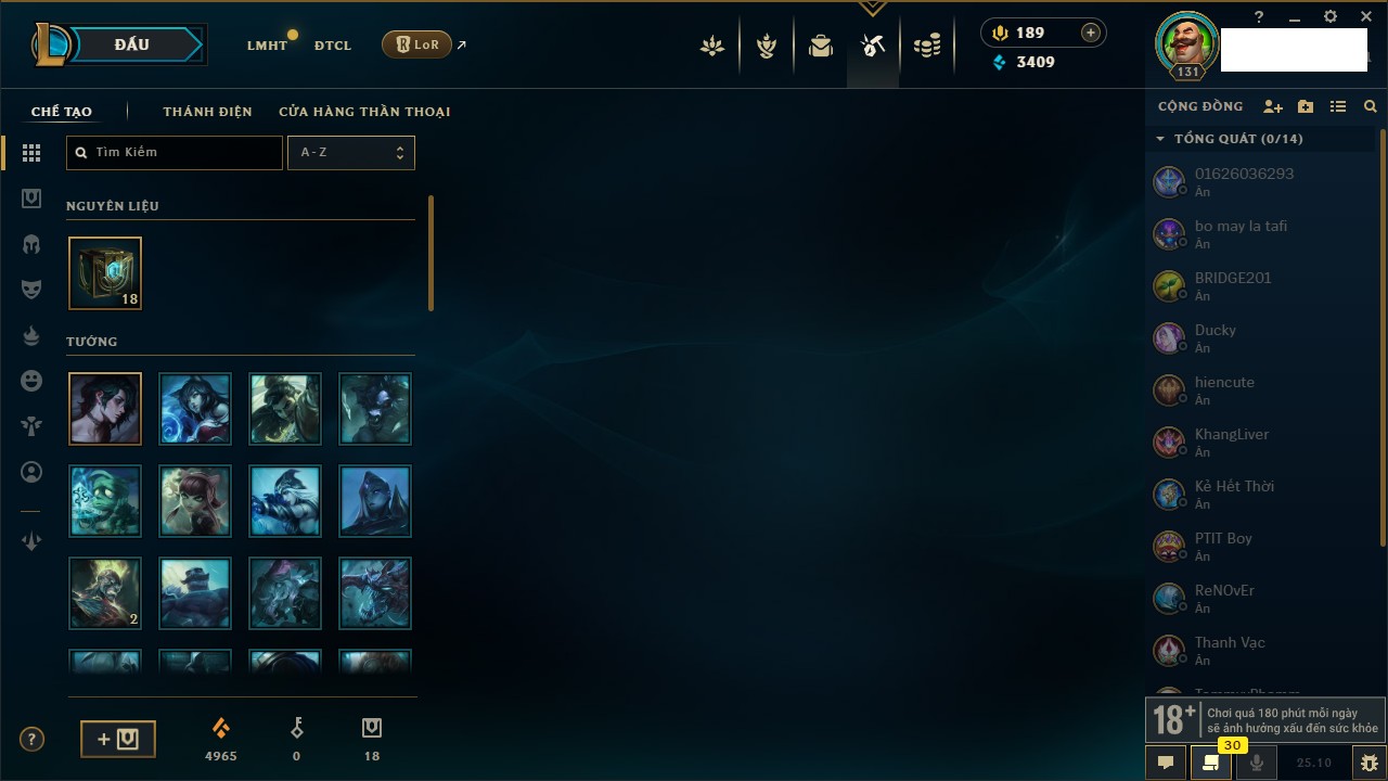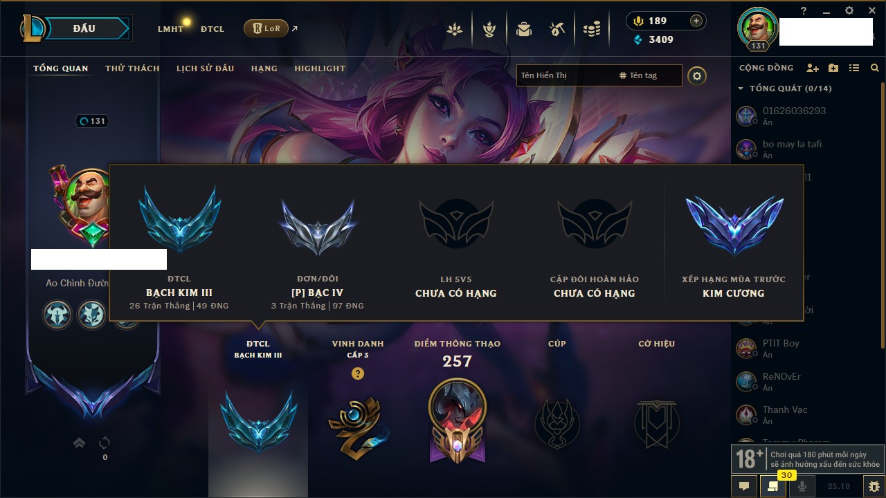 Rank Đơn: Chưa rank mùa nào Khung: Chưa có khung Tướng: 170 - Còn 3409 THX Trang Phục: 54 Rank ĐTCL: Chưa Rank Linh Thú: 170