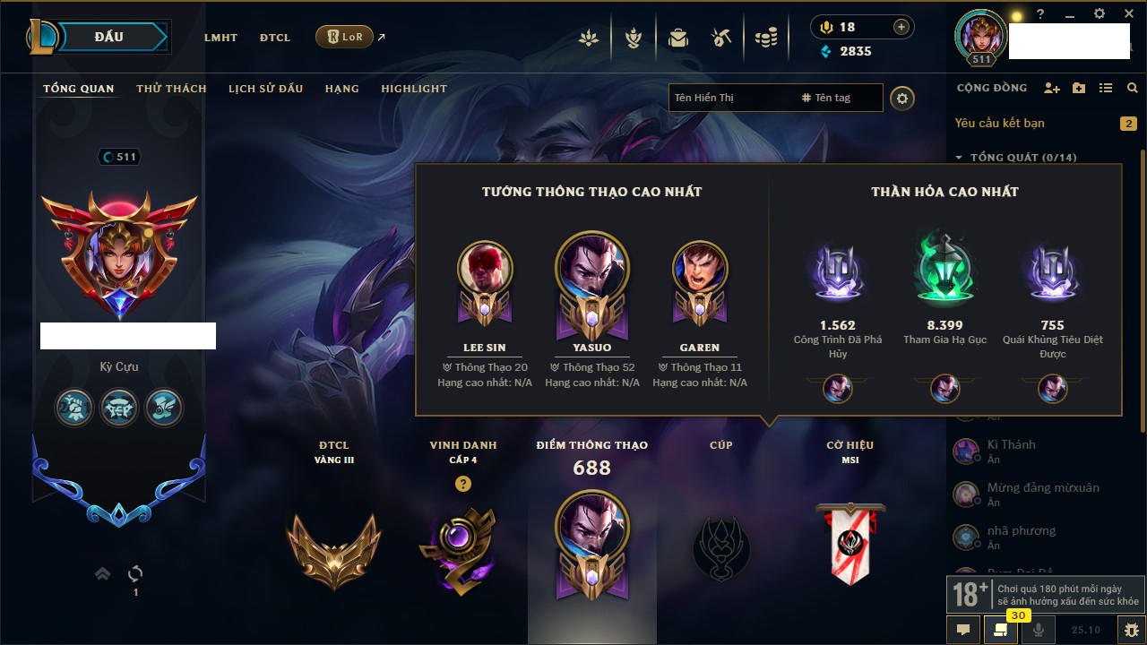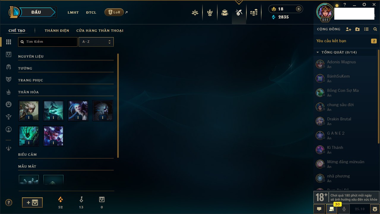 Rank Đơn: Bạch Kim IVKhung: Bạch kimTướng: 171 - Còn 182788 THXTrang Phục: 158Rank ĐTCL: Lục Bảo IVLinh Thú: 56