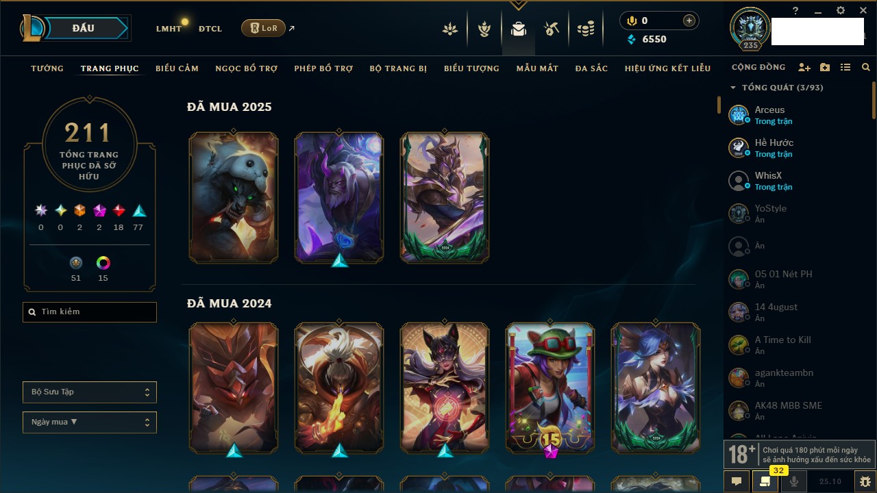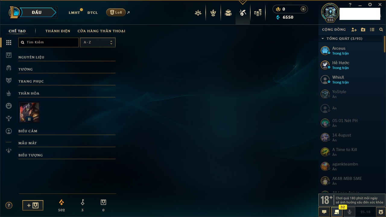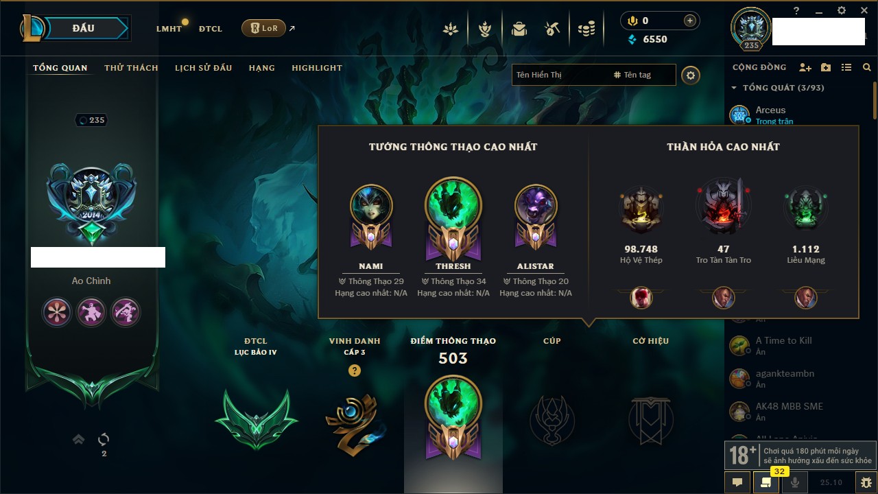 Rank Đơn: Bạch Kim IIKhung: Bạch kimTướng: 171 - Còn 316137 THXTrang Phục: 89Rank ĐTCL: Bạch Kim IIILinh Thú: 94