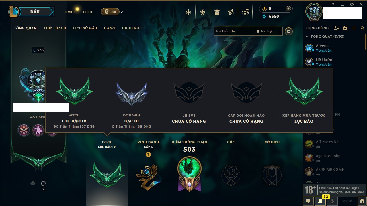 Rank Đơn: Lục Bảo IVKhung: VàngTướng: 171 - Còn 154648 THXTrang Phục: 203Rank ĐTCL: Bạch Kim IVLinh Thú: 69