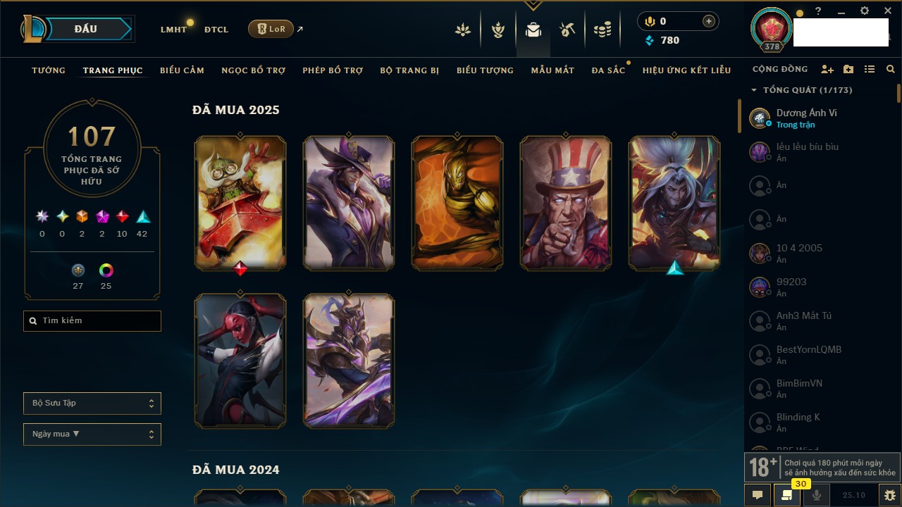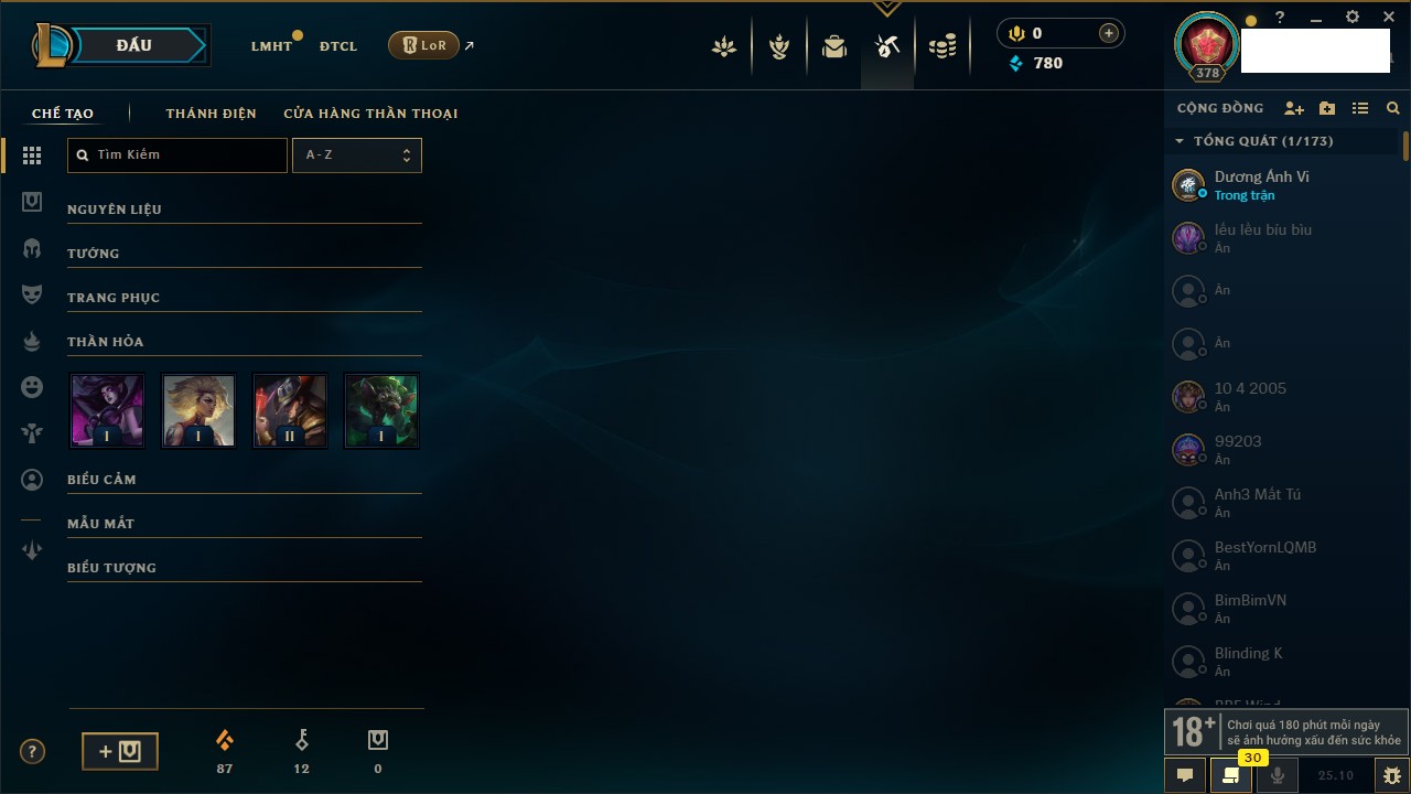 Rank Đơn: Vàng IIIKhung: BạcTướng: 171 - Còn 101359 THXTrang Phục: 88Rank ĐTCL: Kim Cương IVLinh Thú: 200