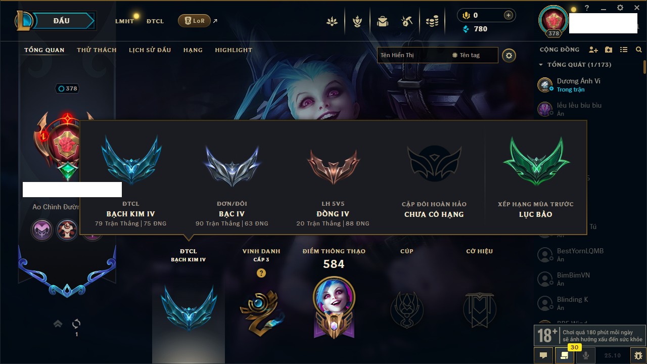 Rank Đơn: Đồng IVKhung: SắtTướng: 163 - Còn 65150 THXTrang Phục: 234Rank ĐTCL: Đồng IIILinh Thú: 39