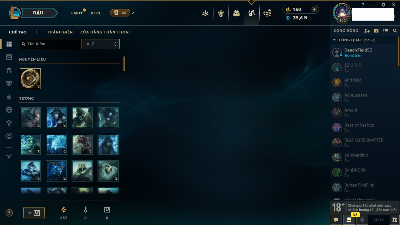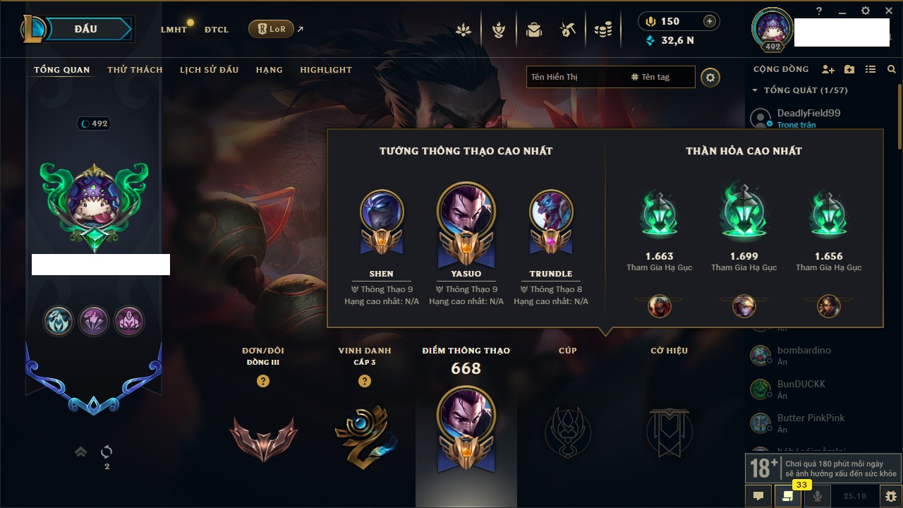 Rank Đơn: Vàng IKhung: BạcTướng: 171 - Còn 60584 THXTrang Phục: 286Rank ĐTCL: Vàng IIILinh Thú: 117