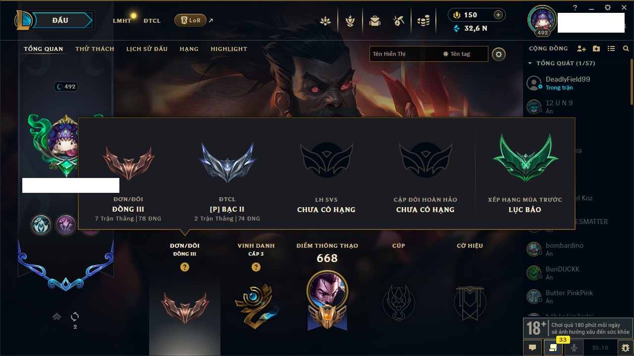 Rank Đơn: Bạch Kim IIIKhung: Lục BảoTướng: 172 - Còn 453285 THXTrang Phục: 220Rank ĐTCL: Chưa RankLinh Thú: 104