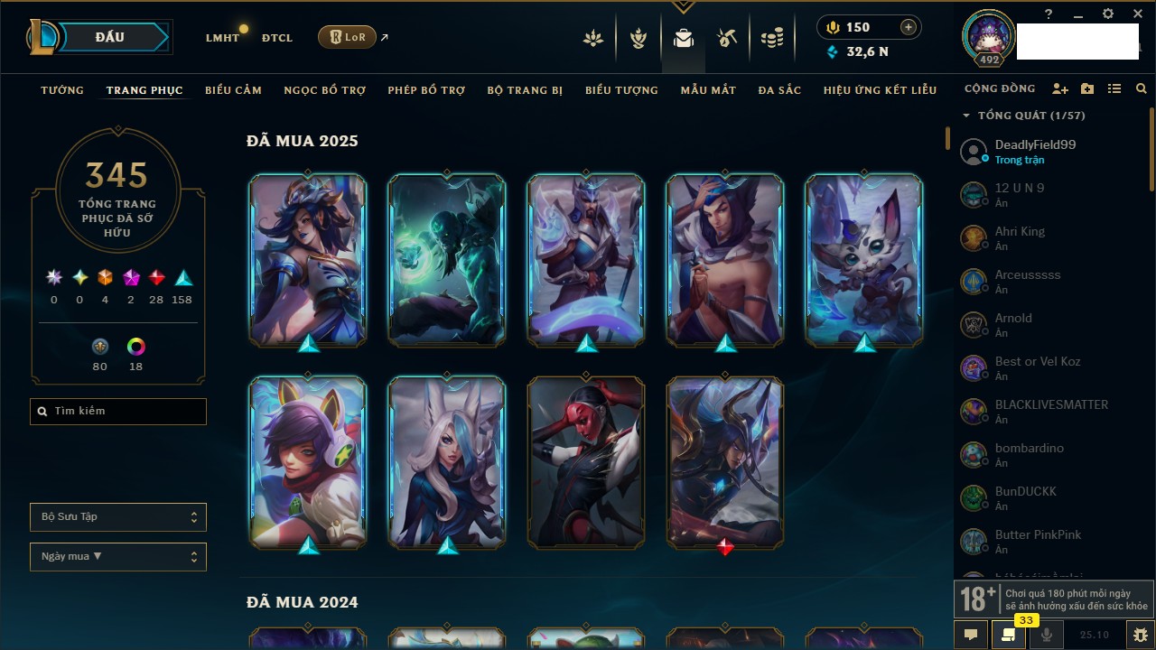 Rank Đơn: Vàng IIIKhung: VàngTướng: 171 - Còn 88128 THXTrang Phục: 329Rank ĐTCL: Chưa RankLinh Thú: 41