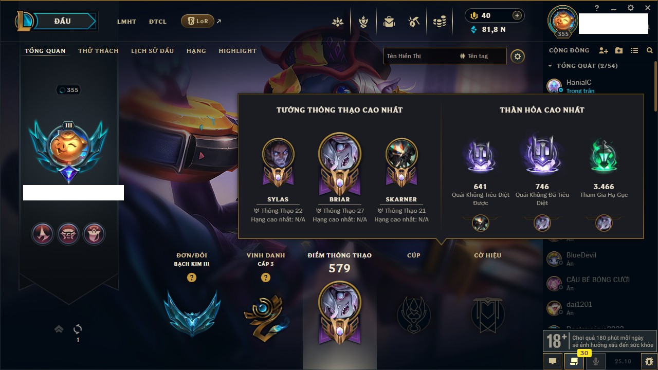 Rank Đơn: Bạch Kim IVKhung: Bạch kimTướng: 171 - Còn 54021 THXTrang Phục: 327Rank ĐTCL: Chưa RankLinh Thú: 115