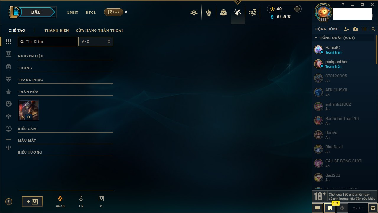Rank Đơn: Vàng IKhung: BạcTướng: 171 - Còn 60584 THXTrang Phục: 286Rank ĐTCL: Vàng IIILinh Thú: 117