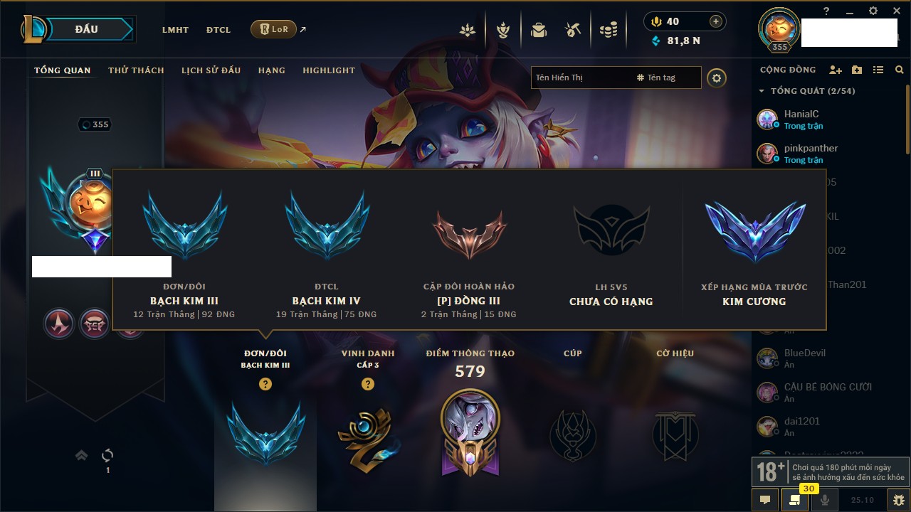 Rank Đơn: Bạch Kim IIKhung: Bạch kimTướng: 171 - Còn 141298 THXTrang Phục: 274Rank ĐTCL: Bạch Kim IILinh Thú: 188