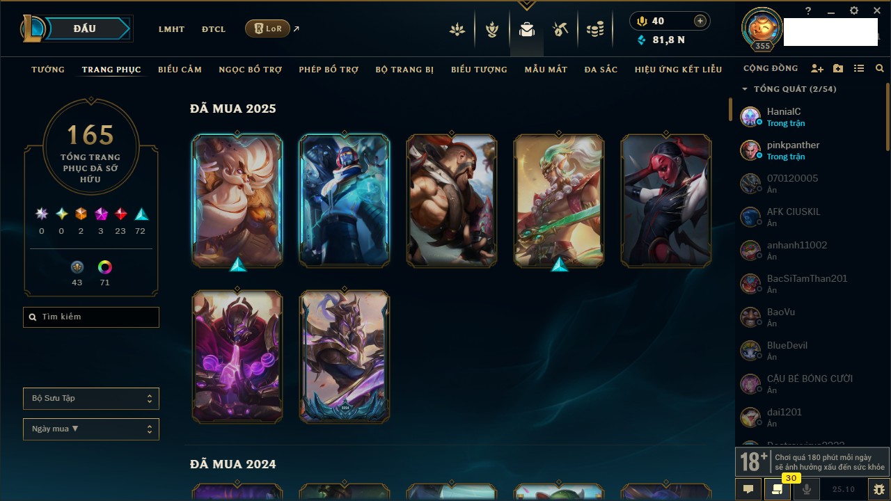 Rank Đơn: Vàng IIIKhung: VàngTướng: 171 - Còn 88128 THXTrang Phục: 329Rank ĐTCL: Chưa RankLinh Thú: 41
