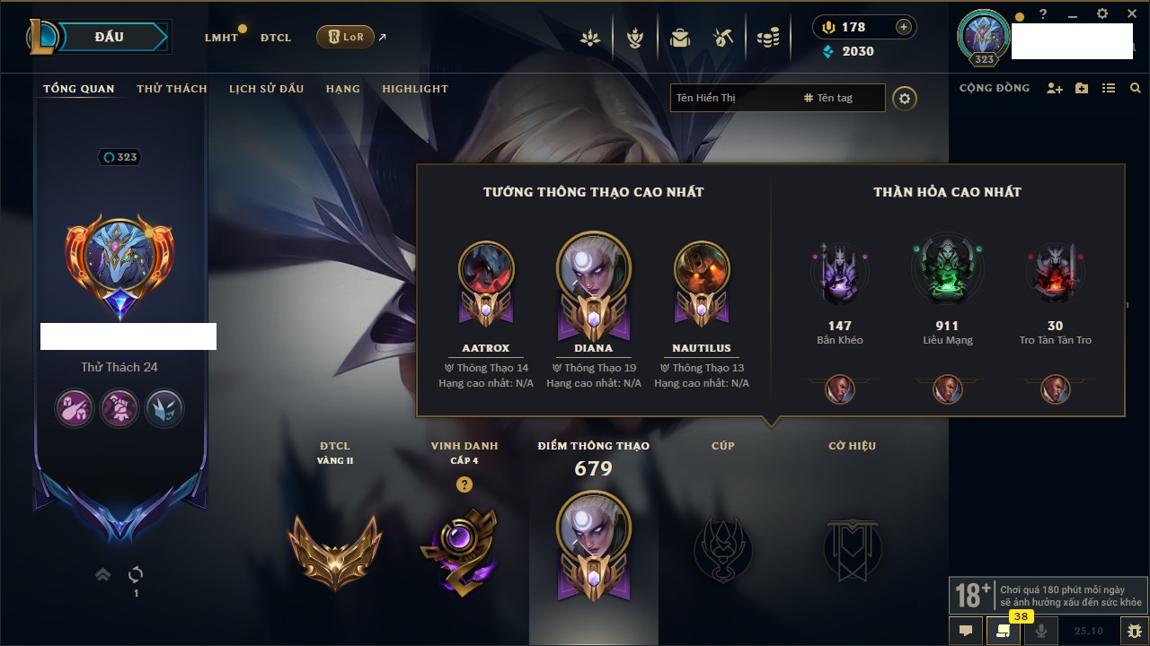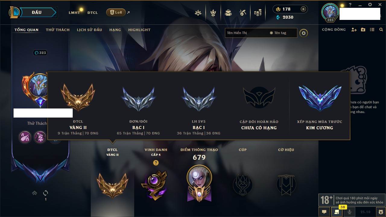 Rank Đơn: Bạc IIKhung: VàngTướng: 171 - Còn 332462 THXTrang Phục: 165Rank ĐTCL: Kim Cương IVLinh Thú: 181