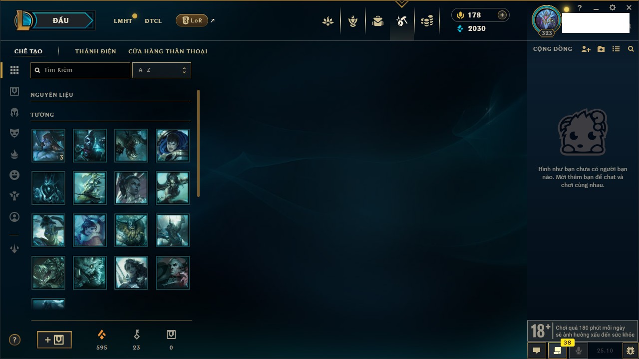 Rank Đơn: Vàng IVKhung: VàngTướng: 171 - Còn 48721 THXTrang Phục: 171Rank ĐTCL: Chưa RankLinh Thú: 27