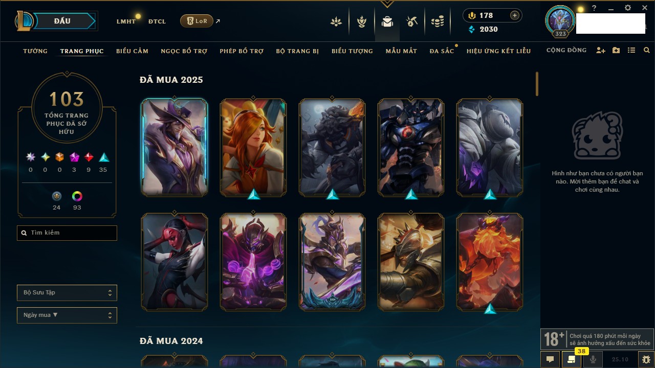 Rank Đơn: Vàng IVKhung: BạcTướng: 166 - Còn 180925 THXTrang Phục: 163Rank ĐTCL: Chưa RankLinh Thú: 67