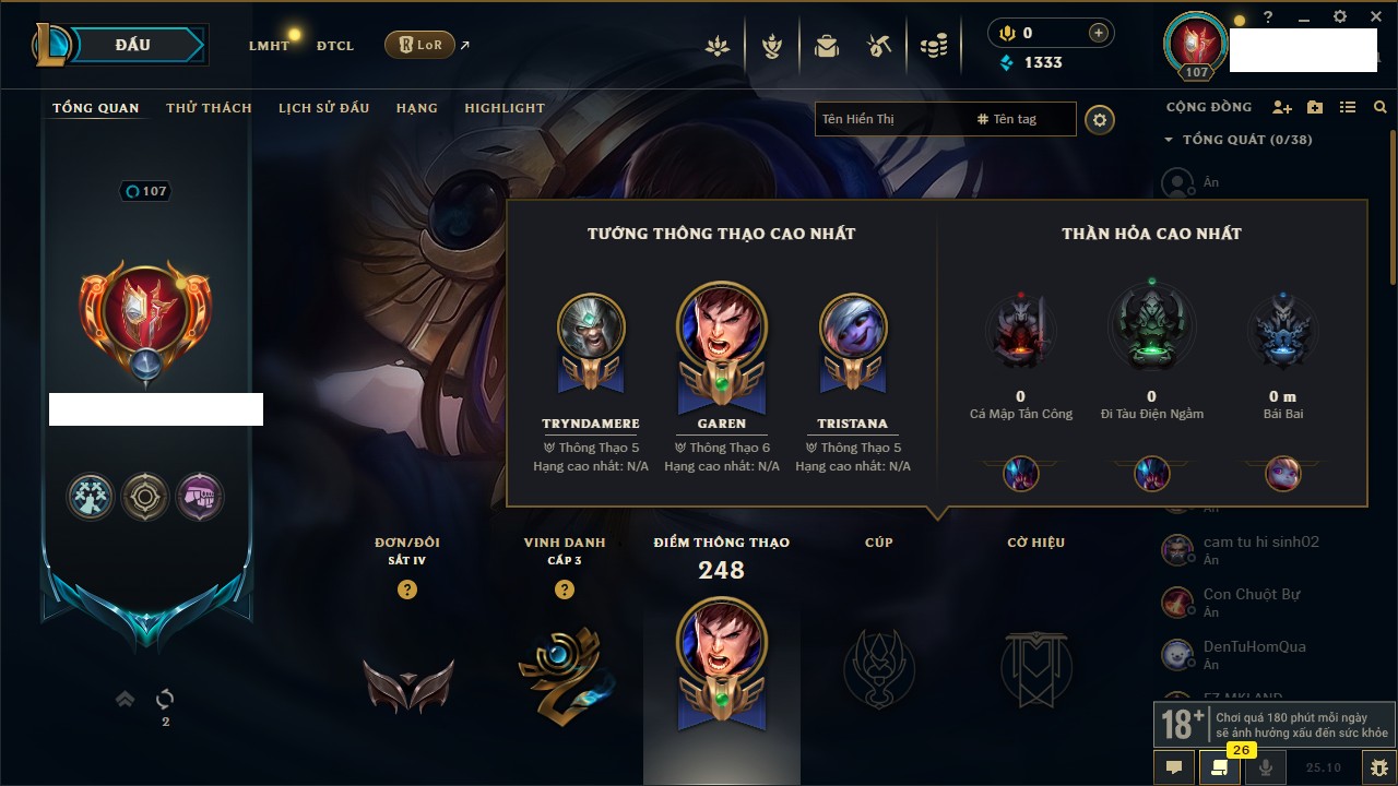 Rank Đơn: Lục Bảo IVKhung: VàngTướng: 171 - Còn 154648 THXTrang Phục: 203Rank ĐTCL: Bạch Kim IVLinh Thú: 69