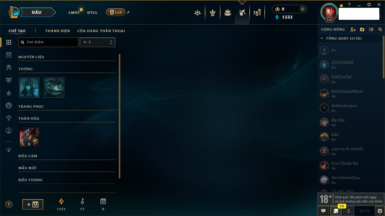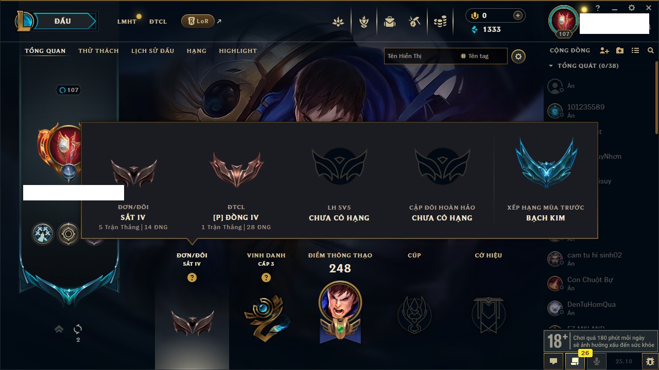 Rank Đơn: Bạch Kim IIKhung: Bạch kimTướng: 171 - Còn 316137 THXTrang Phục: 89Rank ĐTCL: Bạch Kim IIILinh Thú: 94