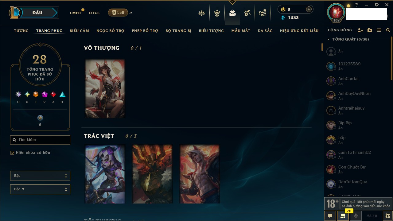 Rank Đơn: Vàng IIKhung: VàngTướng: 170 - Còn 243330 THXTrang Phục: 230Rank ĐTCL: Chưa RankLinh Thú: 68