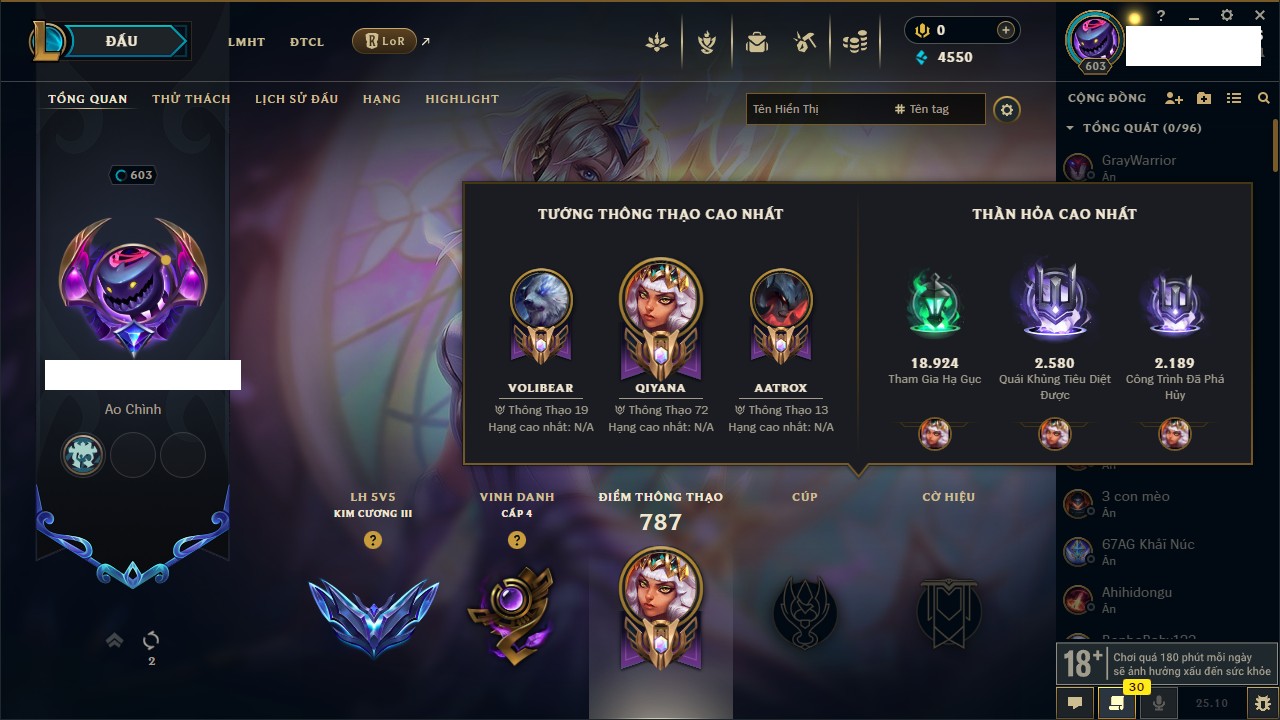 Rank Đơn: Bạc IKhung: Bạch kimTướng: 86 - Còn 1608 THXTrang Phục: 47Rank ĐTCL: Chưa RankLinh Thú: 58