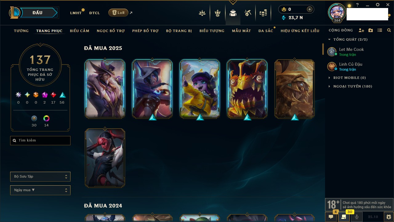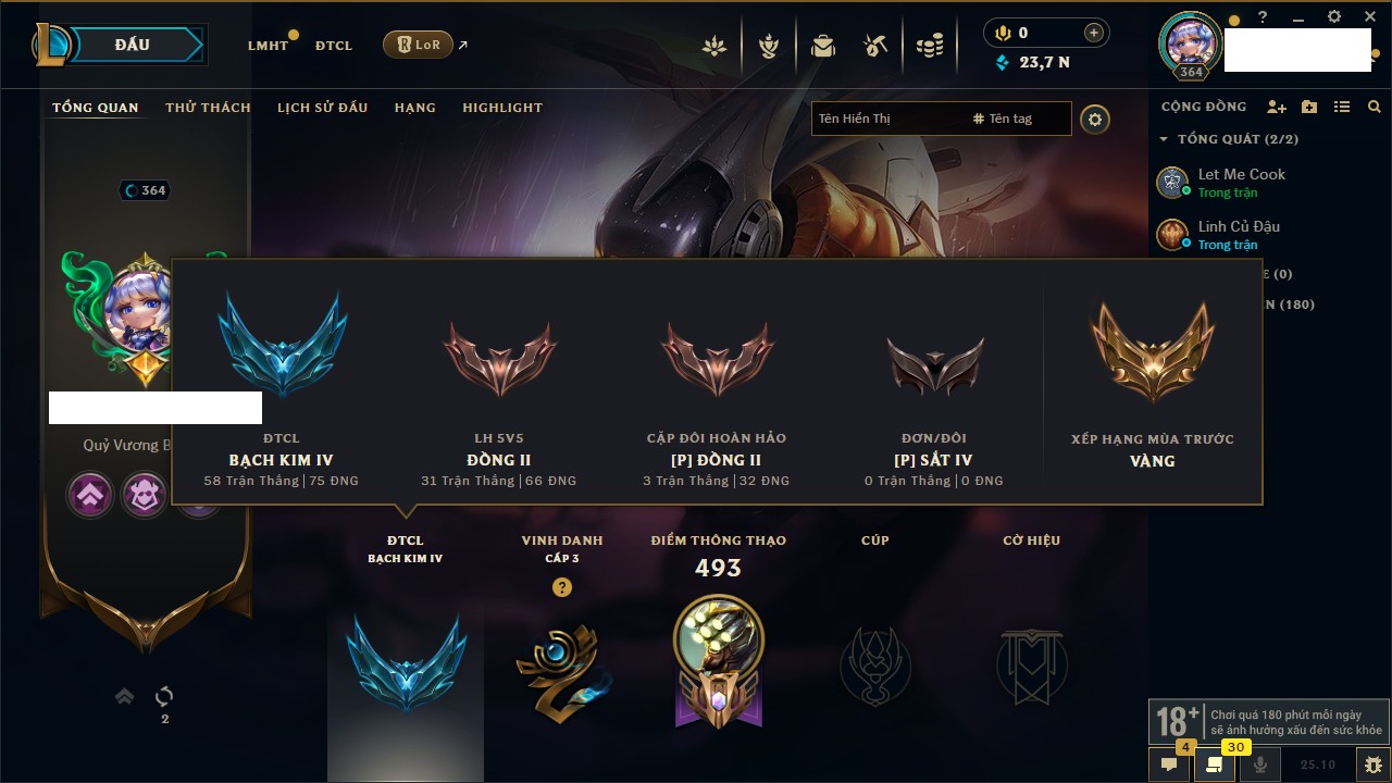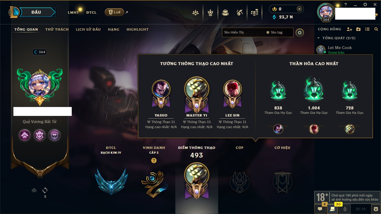 Rank Đơn: Bạch Kim IIKhung: Bạch kimTướng: 171 - Còn 316137 THXTrang Phục: 89Rank ĐTCL: Bạch Kim IIILinh Thú: 94