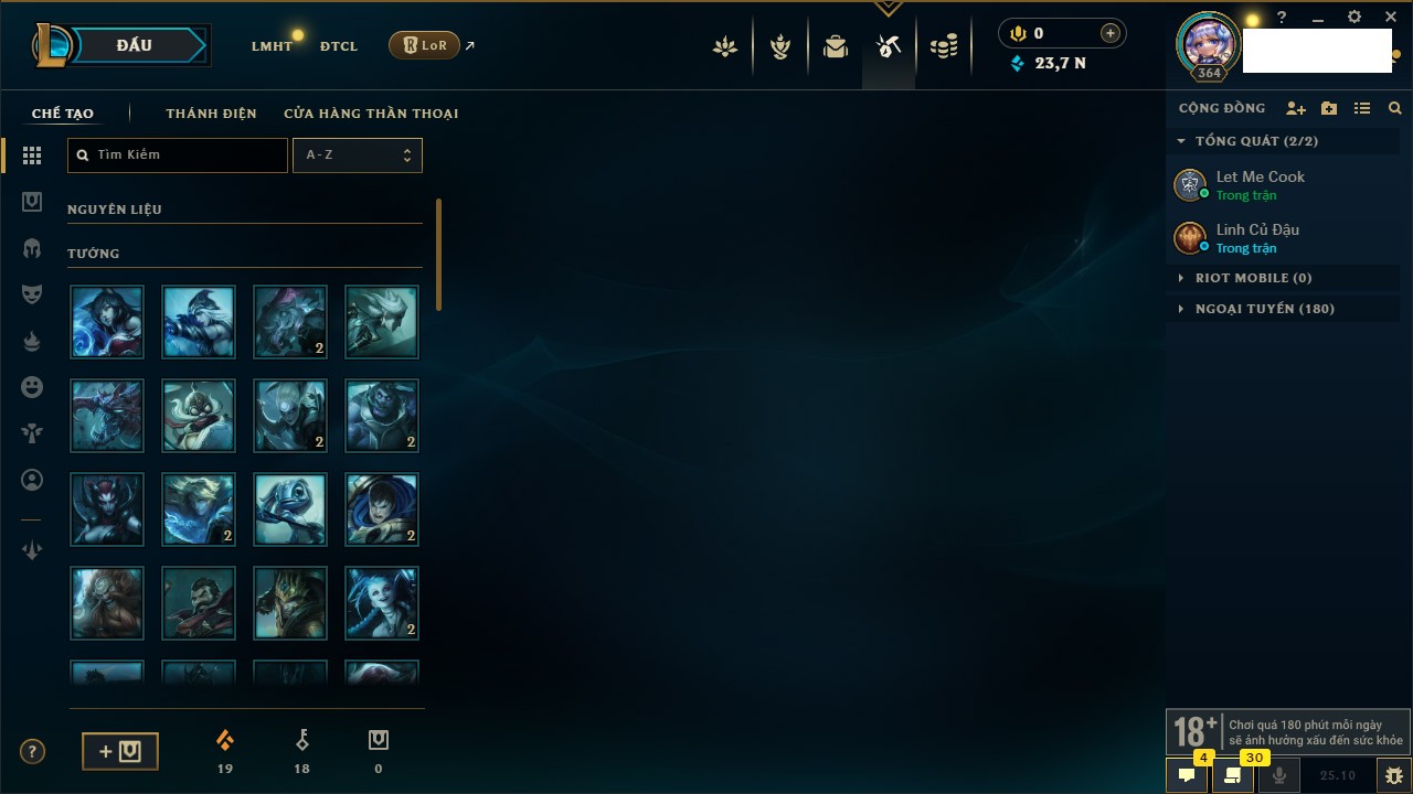 Rank Đơn: Lục Bảo IVKhung: VàngTướng: 171 - Còn 154648 THXTrang Phục: 203Rank ĐTCL: Bạch Kim IVLinh Thú: 69