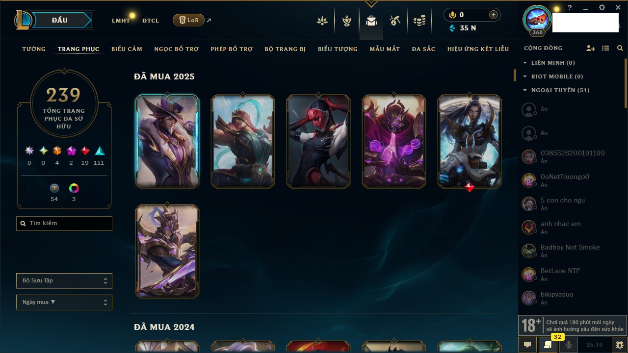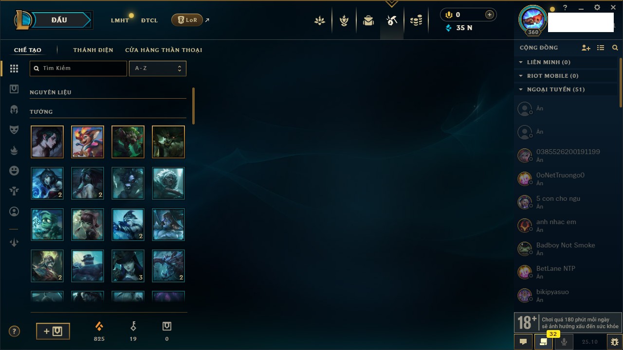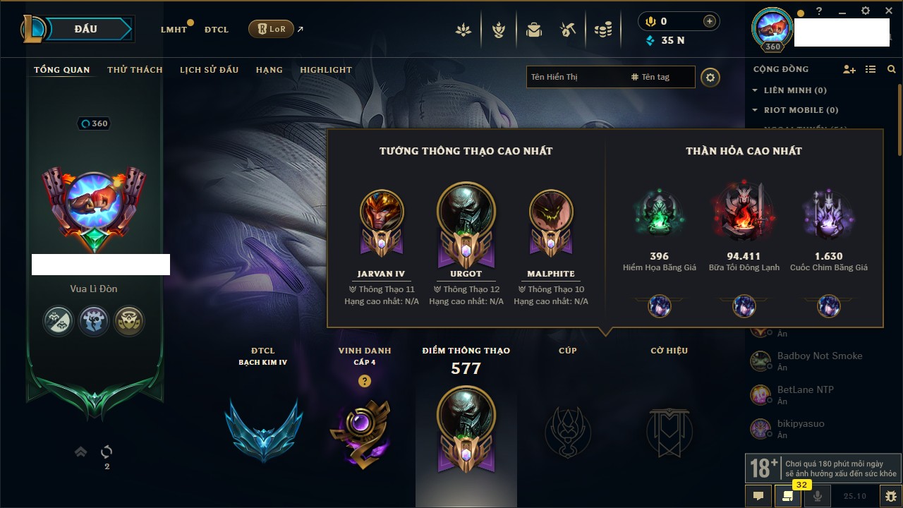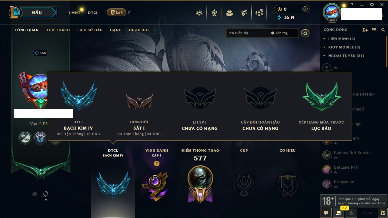 Rank Đơn: Bạc IIKhung: Bạch kimTướng: 169 - Còn 81813 THXTrang Phục: 301Rank ĐTCL: Chưa RankLinh Thú: 140