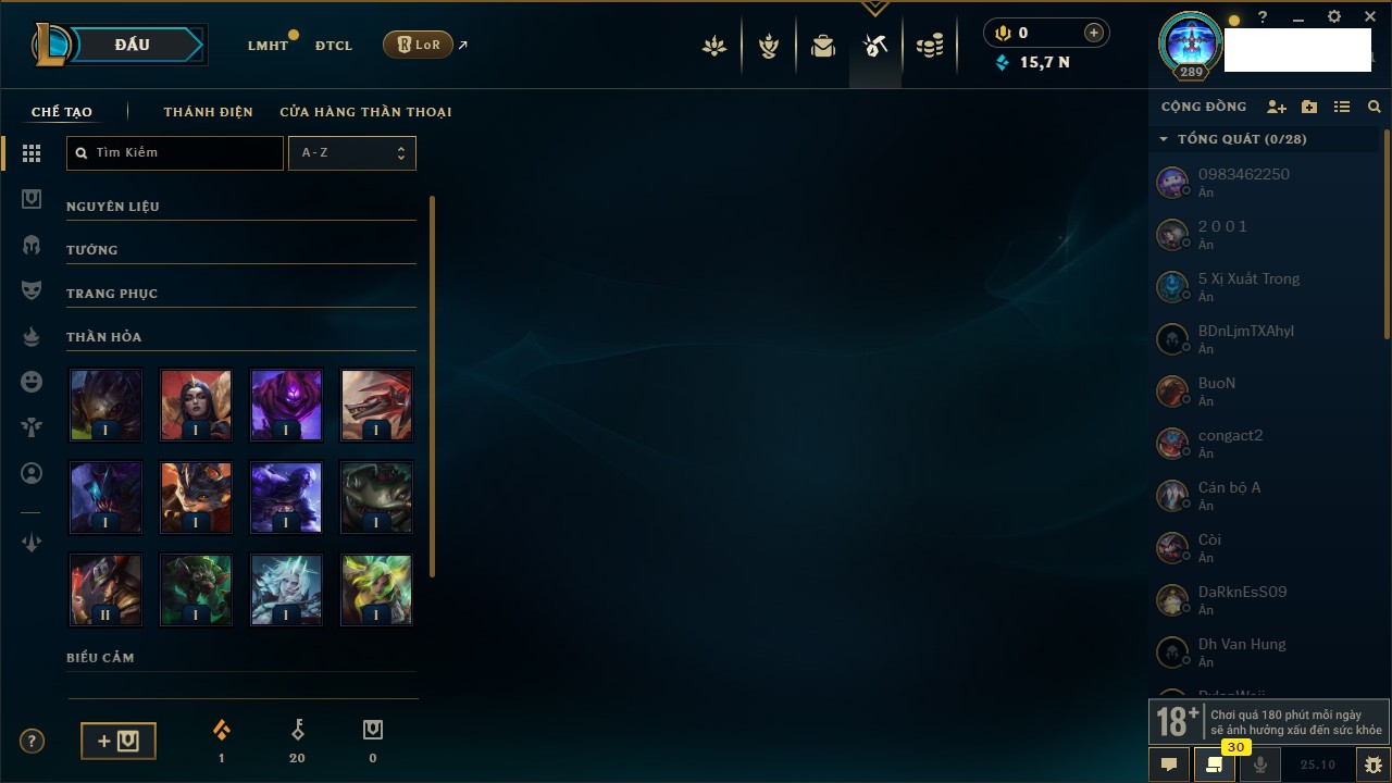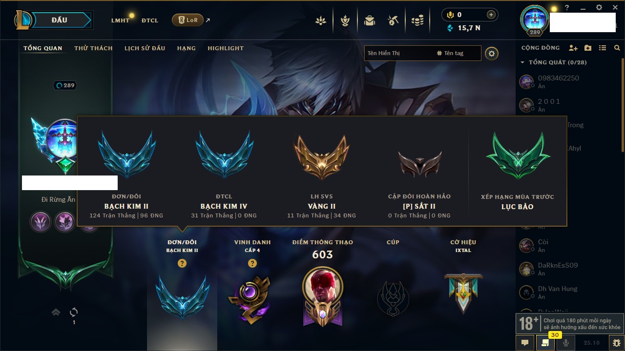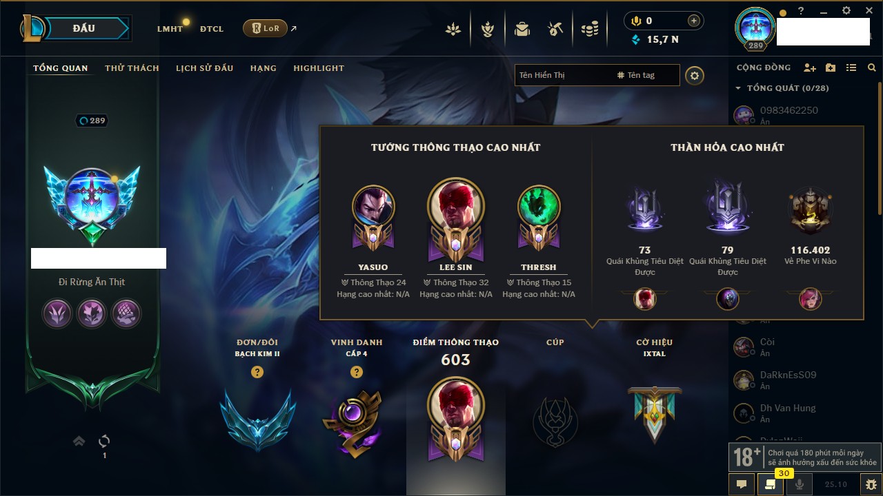 Rank Đơn: Bạch Kim IIKhung: Bạch kimTướng: 171 - Còn 316137 THXTrang Phục: 89Rank ĐTCL: Bạch Kim IIILinh Thú: 94