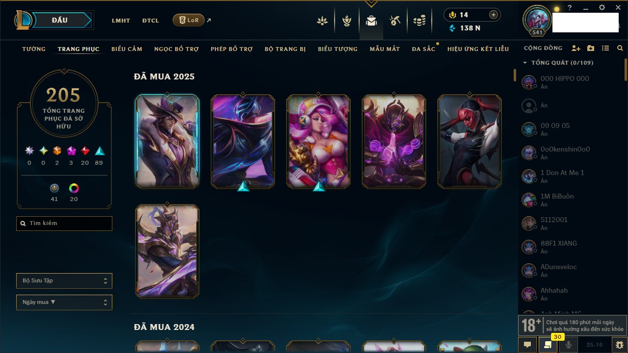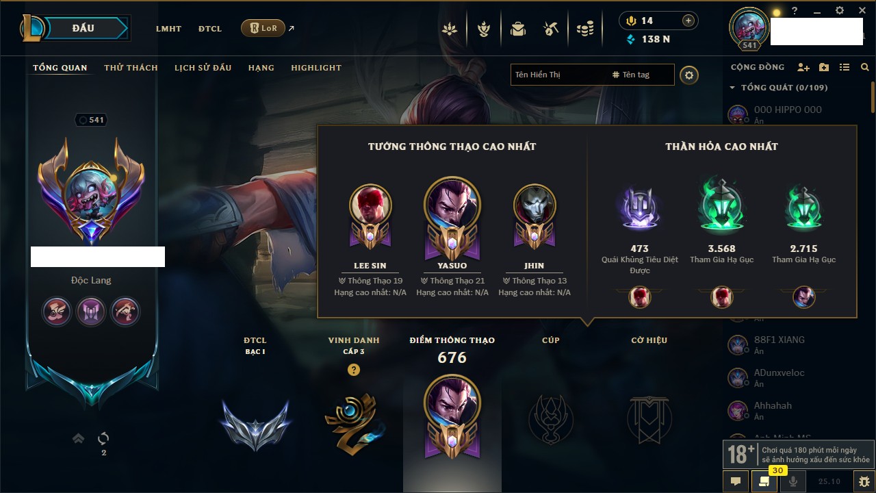 Rank Đơn: Bạc IIKhung: Bạch kimTướng: 169 - Còn 81813 THXTrang Phục: 301Rank ĐTCL: Chưa RankLinh Thú: 140