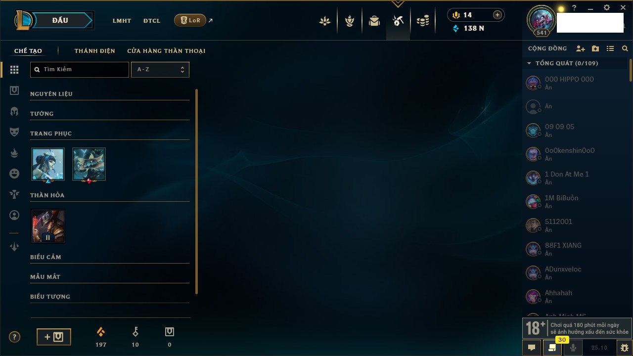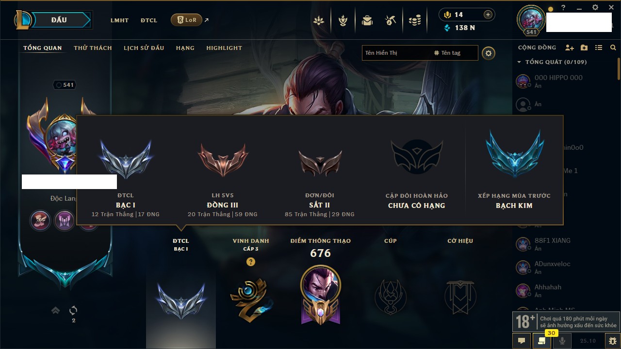 Rank Đơn: Sắt IVKhung: SắtTướng: 171 - Còn 231744 THXTrang Phục: 376Rank ĐTCL: Bạch Kim IILinh Thú: 120