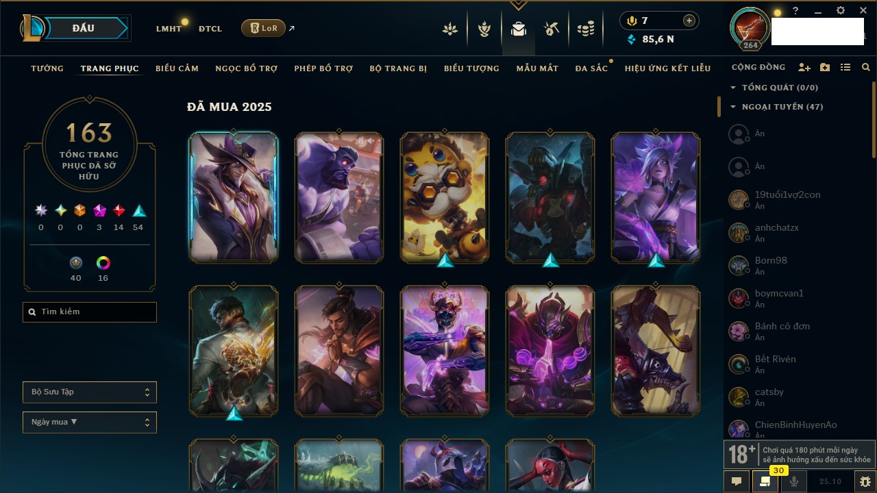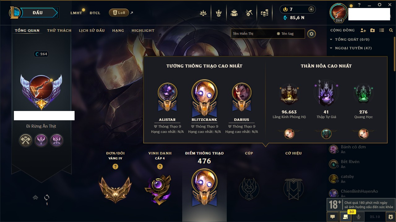 Rank Đơn: Bạch Kim IIIKhung: Bạch kimTướng: 59 - Còn 20316 THXTrang Phục: 29Rank ĐTCL: Chưa RankLinh Thú: 3