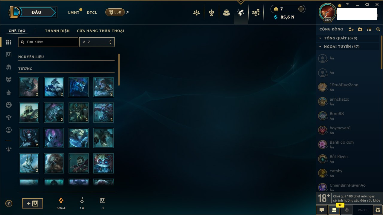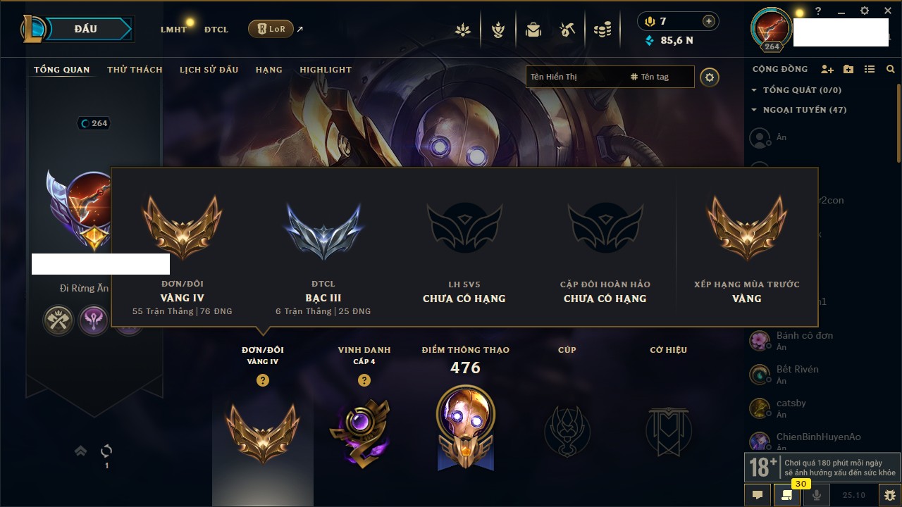Rank Đơn: Vàng IVKhung: BạcTướng: 171 - Còn 116977 THXTrang Phục: 142Rank ĐTCL: Đồng IILinh Thú: 97