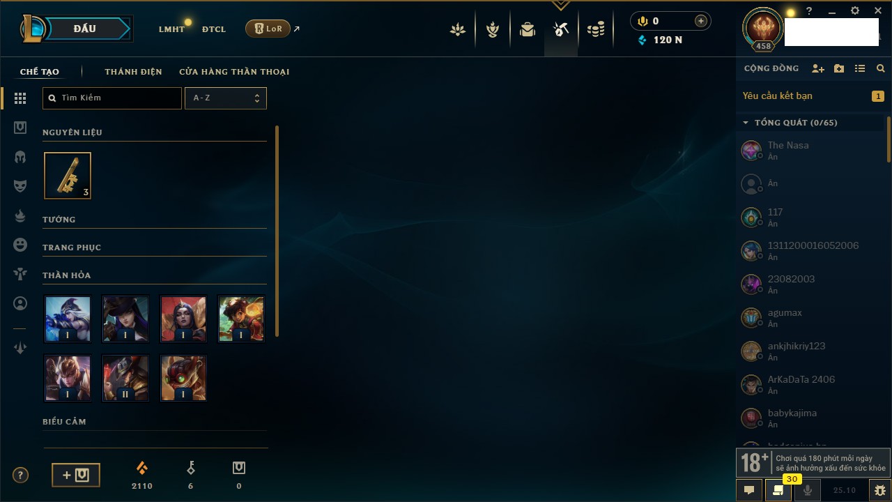 Rank Đơn: Bạch Kim IIIKhung: Bạch kimTướng: 170 - Còn 61079 THXTrang Phục: 352Rank ĐTCL: Sắt IILinh Thú: 70