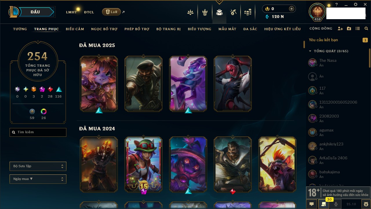 Rank Đơn: Vàng IKhung: Bạch kimTướng: 170 - Còn 212450 THXTrang Phục: 214Rank ĐTCL: Bạch Kim IVLinh Thú: 221