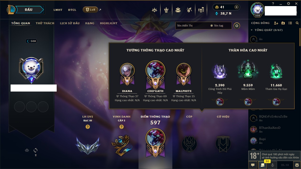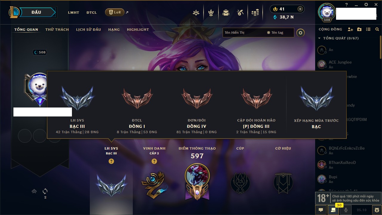 Rank Đơn: Bạc IIIKhung: Chưa có khungTướng: 171 - Còn 21493 THXTrang Phục: 252Rank ĐTCL: Bạch Kim IVLinh Thú: 123