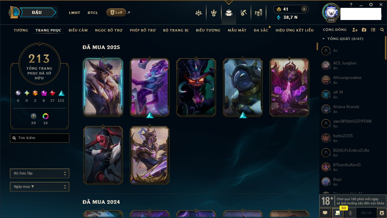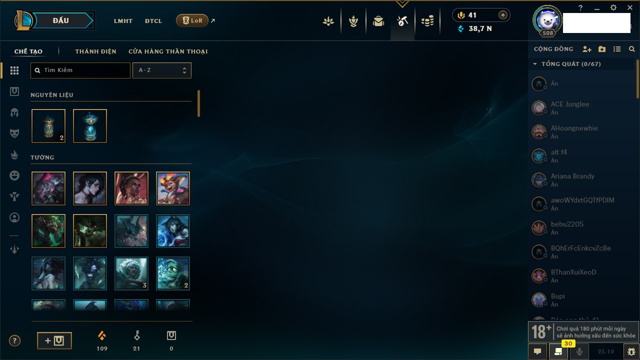 Rank Đơn: Vàng IIKhung: VàngTướng: 171 - Còn 34018 THXTrang Phục: 250Rank ĐTCL: Sắt IILinh Thú: 19