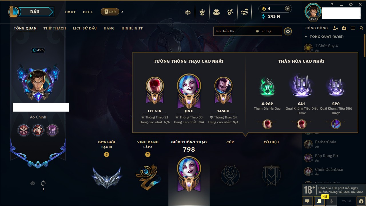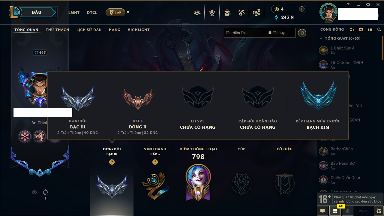 Rank Đơn: Sắt IVKhung: SắtTướng: 171 - Còn 231744 THXTrang Phục: 376Rank ĐTCL: Bạch Kim IILinh Thú: 120