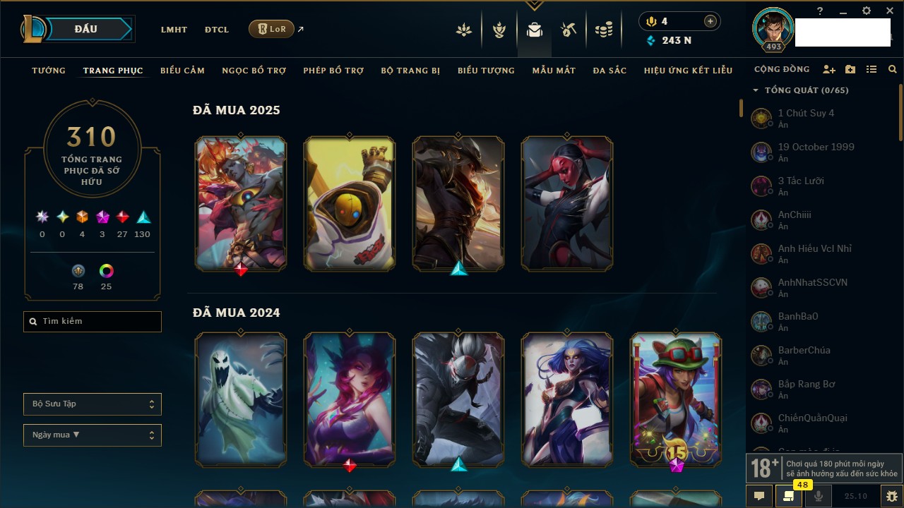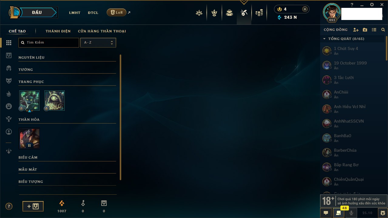 Rank Đơn: Bạc IIKhung: Bạch kimTướng: 169 - Còn 81813 THXTrang Phục: 301Rank ĐTCL: Chưa RankLinh Thú: 140