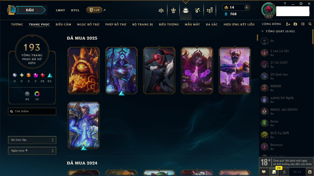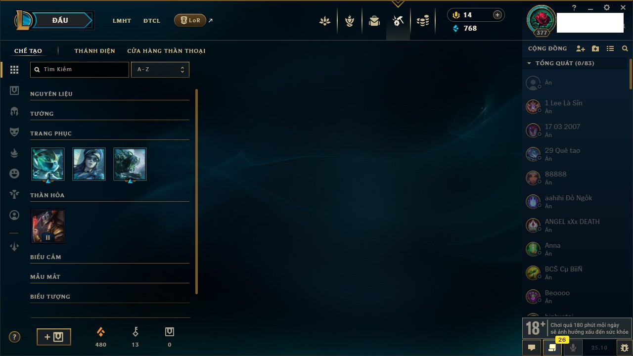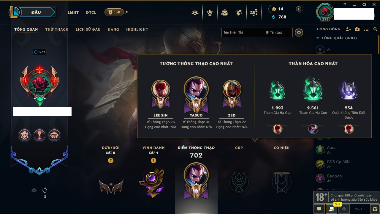 Rank Đơn: Bạch Kim IIKhung: Bạch kimTướng: 171 - Còn 316137 THXTrang Phục: 89Rank ĐTCL: Bạch Kim IIILinh Thú: 94