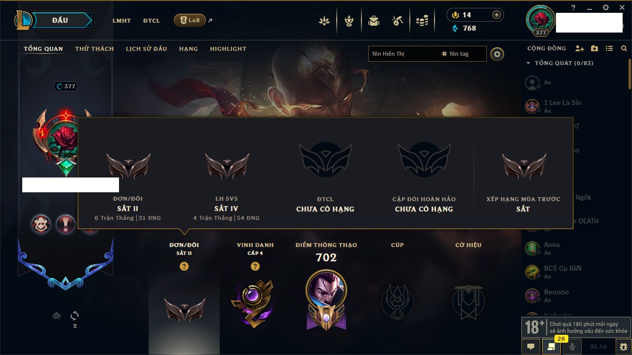 Rank Đơn: Bạch Kim IIIKhung: Bạch kimTướng: 171 - Còn 136108 THXTrang Phục: 261Rank ĐTCL: Bạc IVLinh Thú: 73